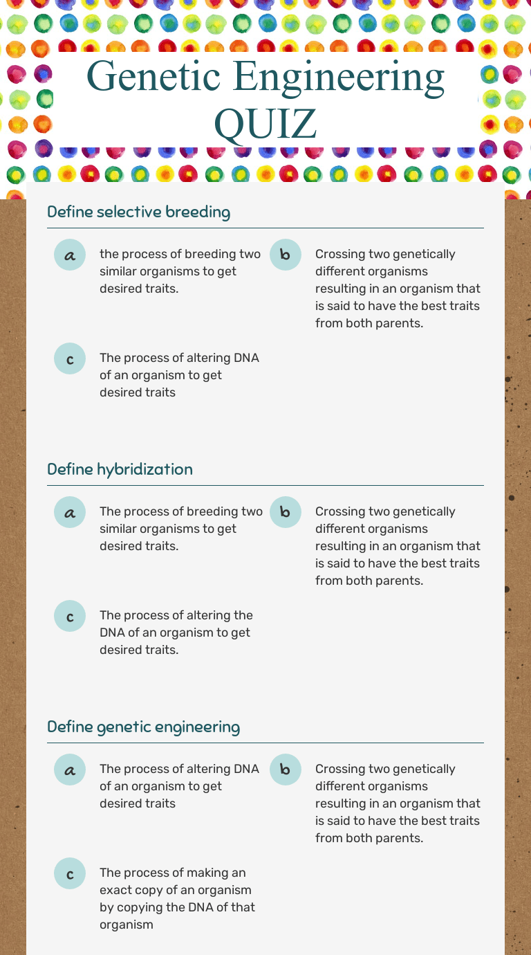 Selective Breeding Worksheet Answers - 1 :. Organisms within a population have genetic differences in their traits called. Today artificial selection is more often called "selective breeding." selective breeding involves breeding animals or plants for a specific, typically desirable . Food chains and farm animals. However, the author also explains that one . Experiments completed to analyzed the .
